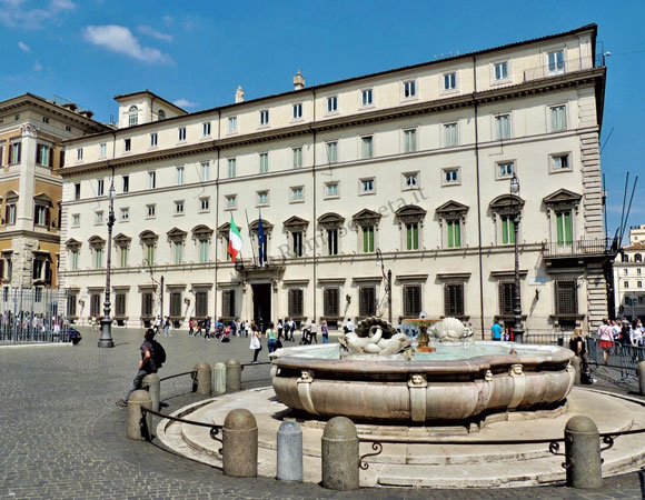 Piazza Colonna custodisce, sul lato opposto, l’edificio del potere, sede della Presidenza del Consiglio dei Ministri: Palazzo Chigi (nella foto 9). La storia della sua costruzione inizia nel 1578 quando l’avvocato concistoriale Pietro Aldobrandini acquistò una casa dalle eredi del notaio Adriano Tedallini ed affidò all’architetto Matteo Bartolini, con la consulenza di Giacomo Della Porta e Carlo Maderno, il compito di unificare il palazzo con altre costruzioni adiacenti. Nel 1587 Flaminia Aldobrandini, vedova di Pietro, vendette il palazzo al nobile Fabrizio Fossano, la cui vedova, Clarice, lo rivendette nel 1616 al cardinale Pietro Aldobrandini (figlio dell’avvocato Pietro), il quale fece eseguire ampliamenti che vennero completati nel 1618. Nel 1621 Olimpia, sorella ed erede del cardinale Pietro, concesse vita natural durante il palazzo al cardinale Giovan Battista Deti, suo congiunto, a condizione che vi apporti molte e varie migliorie di notevole valore, specialmente fabbricando l’angolo di detto palazzo che è volto verso Piazza Colonna. Nel 1630, alla morte del cardinale, come era stato stabilito, il palazzo ritornò ad Olimpia e nel 1637 lo ereditò il figlio, il cardinale Ippolito Aldobrandini, camerlengo di Santa Romana Chiesa. Fu così un’altra Olimpia, la junior, nipote dello zio Ippolito e sposa di Paolo Borghese prima e di Camillo Pamphilj poi, ad entrarne in possesso. Nel 1659 Domenico Chigi, fratello di Papa Alessandro VII, Generale di Santa Romana Chiesa, e don Agostino Chigi, sposo di Virginia Borghese, acquistarono l’edificio. I lavori di ampliamento vennero affidati all’architetto Felice Della Greca, al quale si debbono l’androne porticato, lo scalone su Via del Corso, l’altana verso Montecitorio ed il cortile con la ricchezza dei fregi e degli stucchi. I lavori, dopo la morte del Della Greca, vennero affidati a Giovan Battista Contini al quale si deve l’unificazione definitiva del complesso che assunse in sostanza il monumentale aspetto odierno. Il palazzo spicca per la sua imponente grandezza, con forti bugnature ai lati, balcone ad angolo ed un altro su Via del Corso: la porta-finestra di quest’ultimo ha il timpano spezzato perché vi era lo stemma di Alessandro VII, collocato poi nell’androne. La facciata principale è quella su Via del Corso, ma in realtà il portone è sempre chiuso. Questa facciata presenta, al pianterreno, il portale sovrastato dal balcone tra finestre con davanzali su mensole e sottostanti finestrelle. Al piano nobile le finestre presentano timpani alternativamente curvilinei e triangolari; le finestre del secondo piano, dopo quelle del mezzanino, poggiano su una cornice marcapiano. A coronamento il cornicione con l’attico, eretto poco prima della fine del Seicento. La facciata su Piazza Colonna è abbastanza simile alla precedente, con la finestra centrale che apre su un balcone poggiante sull’architrave del portale, che fu aperto nel 1739, con accesso al grande cortile porticato dove si trova una bella fontana costituita da un mascherone con rami di quercia (appartenenti allo stemma Della Rovere) sormontato dal monte e dalla stella, elementi araldici dei Chigi. Ai lati del portale, le finestre inferriate ed architravate con mensole sottostanti e finestrella. Da questo prospetto si eleva, sopra l’attico, la monumentale altana della fine del Seicento. Il palazzo rimase ai Chigi fino al 1917, anche se fu affittato, dopo il 1870, all’Austria che vi insediò la sua Ambasciata. Nel 1917 Luigi Ludovico Chigi Della Rovere Albani decise di venderlo allo Stato italiano, che lo destinò a sede del Ministero delle Colonie, poi del Ministero degli Esteri e dal 1961 della Presidenza del Consiglio dei Ministri. In questa piazza, il 30 ottobre 1866, fu effettuato il primo esperimento di pubblica illuminazione elettrica, anche se si dovette attendere il luglio del 1912 affinché fosse utilizzato questo tipo di illuminazione in modo definitivo.