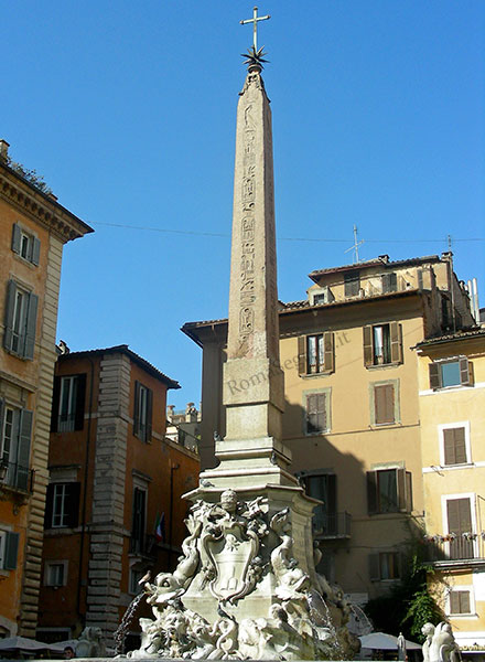 Inoltre, fece sostituire il vaso centrale con una scogliera che sorregge un piccolo obelisco denominato Macuteo (nella foto 4) perché, rinvenuto alla fine del XIV secolo presso la chiesa di S.Maria sopra Minerva, fu collocato inizialmente presso la vicina chiesa di S.Macuto. L’obelisco, alto 6,34 metri, originariamente era situato, insieme a quello oggi posto a Villa Celimontana, nel Tempio del Sole ad Eliopoli, entrambi costruiti da Ramsete II e poi trasferiti nell’Iseo di Roma (insieme agli obelischi di Piazza Navona, Villa Celimontana, Piazza della Minerva e di Via delle Terme di Diocleziano), il famoso santuario della comunità egizia di Roma imperiale, dove tutti gli obelischi furono rinvenuti.