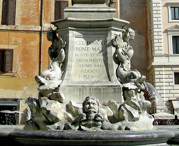La scogliera rocciosa (nella foto 5), ornata da delfini, dalla stella degli Albani (la famiglia papale di Clemente XI) e dalla Croce, è opera dell’architetto Filippo Barigioni e dello scultore romano Vincenzo Felici. L’iscrizione così recita: