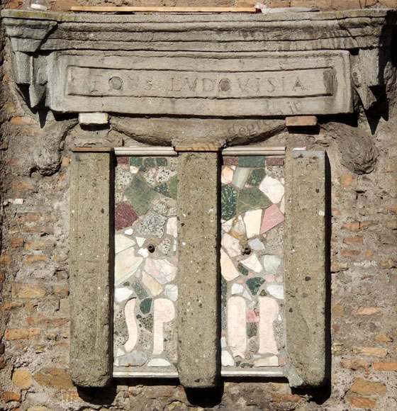 Interessante è, senza dubbio, la parte superiore del prospetto (nella foto 1), costituita da un piccolo architrave curvilineo in pietra all’interno del quale appare la scritta “FONS LUDOVISIA”: molto probabilmente indica che era un elemento situato all’interno della meravigliosa Villa Ludovisi, scomparsa alla fine dell’Ottocento per la realizzazione del Rione Ludovisi e che si estendeva proprio in questa zona. Quindi è lecito supporre che i frammenti, qui riassemblati, potrebbero essere quanto rimane di una più antica e nobile fontana che terminava con colonnine laterali di cui rimangono una sorta di pinnacolo o pseudo capitello sulla destra dell’architrave.