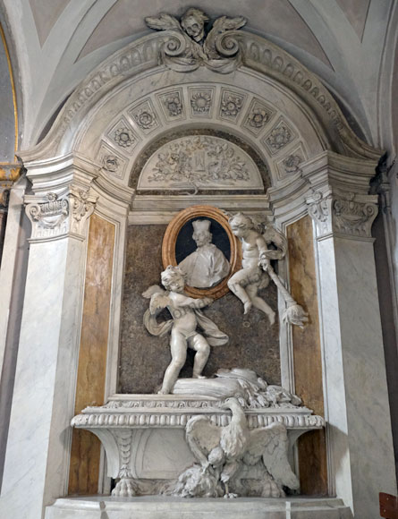 La chiesa custodisce anche il magnifico cenotafio dedicato al cardinale Carlo Bichi (nella foto 6), eseguito su disegno di Carlo de Dominicis, contenuto in una nicchia delimitata da due pilastri che sorreggono un arco al centro del quale è situato un ventaglio di marmo bianco dove è scolpita una clessidra ed un serpente che tiene uniti due rami di quercia. In basso è situato un sarcofago di marmo bianco, davanti al quale si trova un’aquila ad ali aperte con la zampa destra poggiata sulla testa di un leone tramortito che giace sotto il sarcofago (emblemi araldici dei Bichi). Sopra al sarcofago, due putti sorreggono il medaglione su cui è scolpito in bassorilievo il profilo del defunto: uno poggia la gamba sinistra su un cuscino dove si trova anche un cappello cardinalizio, mentre l’altro è in volo con una torcia accesa nella mano sinistra.
