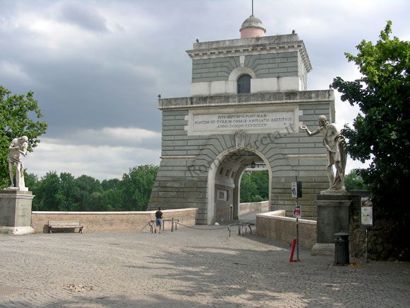 La testata di Ponte Milvio verso Viale Tiziano è ornata con le due statue marmoree dell’Immacolata di Domenico Pigiani (1840) e di S.Giovanni Nepomuceno (nella foto 4) di Agostino Cornacchini (1731). Questo Santo era un boemo (Nepomuceno perché nativo della città di Nepomuk, nell’odierna Repubblica Ceca) ed è ricordato perché venne annegato nella Moldava, per ordine di Re Venceslao IV. Per il suo martirio fu santificato ed a lui si rivolgevano in preghiera tutti coloro che avevano a che fare con i fiumi, per chiederne protezione dagli annegamenti. Si dice anche che questo Santo protegga i segreti: difatti la statua è accompagnata da un puttino che porta l’indice della mano destra sulla sua bocca quasi per invitare al silenzio. L’altro versante del ponte, quello che prospetta su Viale di Tor di Quinto, presenta invece due statue poste ai lati della torretta realizzata da Giuseppe Valadier (visibili nella foto 2) raffiguranti il Battesimo di Gesù Cristo, opera di Francesco Mochi del 1634: a destra si trova S.Giovanni Battista ed a sinistra Gesù Cristo. Il gruppo scultoreo fu realizzato per la Basilica di S.Giovanni dei Fiorentini su commissione della famiglia Falconieri ma, probabilmente, non piacque molto ai committenti tanto che non fu mai posto nella chiesa ma trasportato a Palazzo Falconieri in Via Giulia. Nel 1825 le due statue furono qui collocate da Giuseppe Valadier e vi rimasero fino al 1955, quando vennero trasferite a Palazzo Braschi per un lavoro di restauro, ma in realtà vi rimasero fino al 2016 quando venne deciso di riportarle nella collocazione per la quale erano state progettate, ovvero nella Basilica di S.Giovanni dei Fiorentini. E le statue che oggi sono ai lati della torretta di Ponte Milvio? Sono copie che furono qui poste nel 2001. Il ponte misura metri 152 in lunghezza, metri 7,5 in larghezza ed ha sei arcate in muratura.