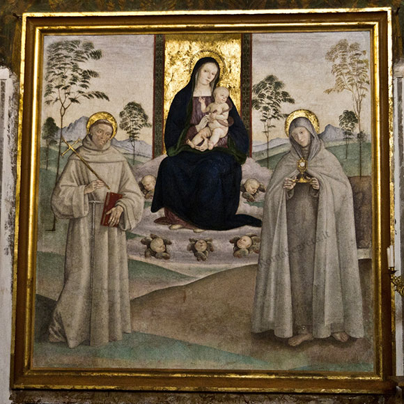 A sinistra dell’altare maggiore è situata una Madonna con Bambino tra S.Francesco e S.Chiara (nella foto 2), meravigliosa opera quattrocentesca di Antonio del Massaro, detto il Pastura, allievo del Pinturicchio. Da segnalare infine che all’interno della chiesa, nella cappella laterale dedicata a S.Severa, è conservato un altare formato da frammenti del Monumento funebre del cardinale Lorenzo Cybo provenienti dalla chiesa di S.Maria del Popolo, donato dal cardinale Alderano Cybo alle Clarisse di S.Cosimato.