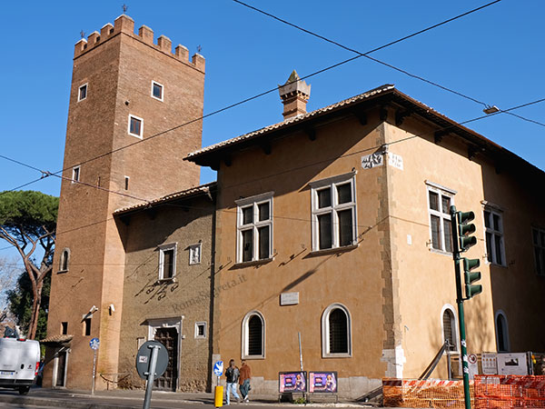 La Torre degli Anguillara e relativo palazzo (nella foto sopra) sono situati in Piazza Sidney Sonnino e costituiscono un unico complesso. Nel loro più antico assetto risalgono al XIII secolo: la prima parte del fabbricato è quella sul lato verso il Tevere, nel quale è ancora riconoscibile il portico con colonne a capitelli in forma di foglie. Fu il conte Everso II a ricostruire quasi dalle fondamenta il palazzo con torre, intorno al 1455, creando, oltretutto, la parte di fabbrica su Via della Lungaretta ed imprimendo ovunque lo stemma con le due anguille incrociate. Nel 1538 il palazzo passò ad Alessandro Picciolotti da Carbognano, amanuense della corte pontificia e vassallo degli Anguillara. Nel 1542 il complesso venne duramente danneggiato da un terremoto e da allora entrò in crisi. Divenne stalla, macello, cantina: prova di questo stato di degrado furono i nomignoli di Carbognano e Palazzaccio con i quali i trasteverini indicarono la costruzione. Infine, nell’Ottocento, la struttura passò ai Forti, una famiglia della borghesia trasteverina, la quale vi insediò una fabbrica di smalti e vetri colorati e la rese nota per un presepio particolarmente artistico.